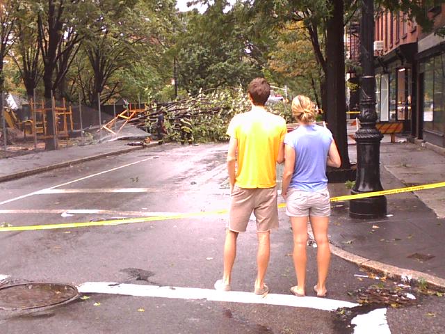 A couple watch as the FDNY cut up a fallen tree on West 4th Street. This storm came up the east coast with massive destructive force, but not in the most-expected, through high winds. Instead, the heavy rainfall and flooding that followed did most damage, even in states like Vermont which would not normally be in the path of a hurricane.